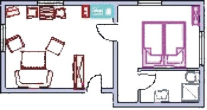 Ferienwohnung für 2 Personen 1. OG (35qm)- Wohnzimmer mit Essgelegenheit und Pantry Küche